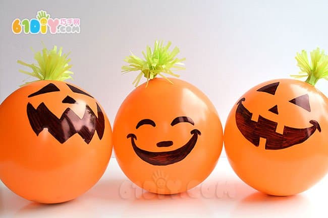 手工材料:橙色气球、记号笔、绿色拷贝纸、剪刀、胶带