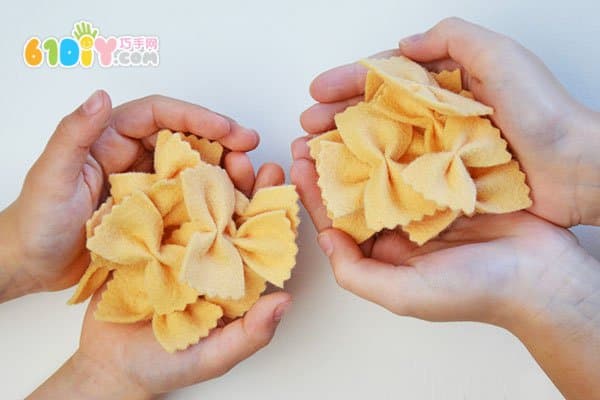 制作方法:用剪刀剪成长布条,然后用花边剪剪成小段,最后用针线系成蝴蝶结的样子就完成了。
