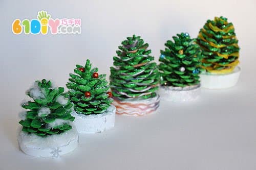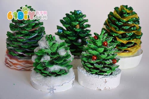 手工材料:松果、石膏粉、亮粉、胶水、颜料、