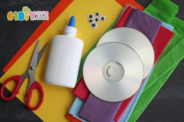 手工材料:旧光盘、卡纸、彩色拷贝纸、胶水、