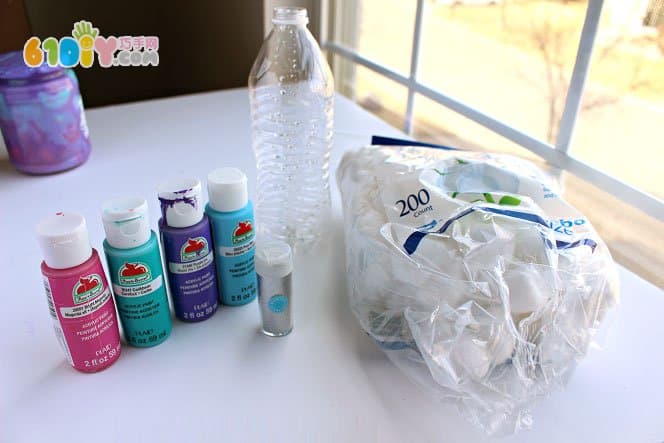 加入几颗棉花球,加入一些颜料和一点水,加入亮粉。用笔去戳这些棉花球。让颜色混合均匀。