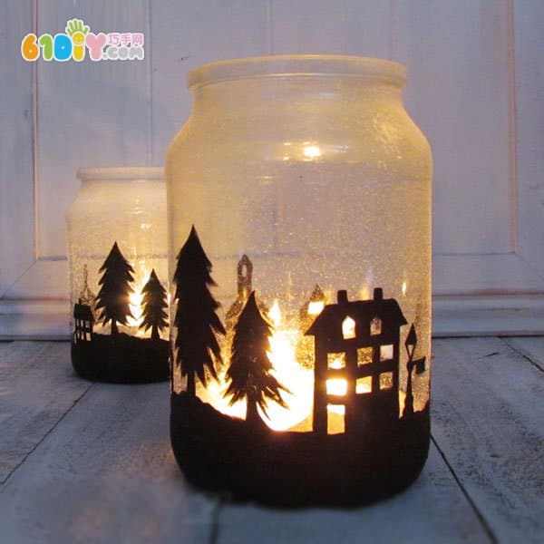 剪好的 房子粘贴在 瓶子外面,瓶子上喷一些雪。瓶子里放上仿真蜡烛,漂亮的雪景就完成了。
