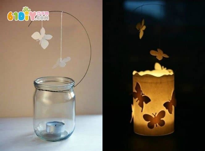 把贴好蝴蝶的纸筒粘贴到 瓶子上,优美的蝴蝶灯笼就做好了。