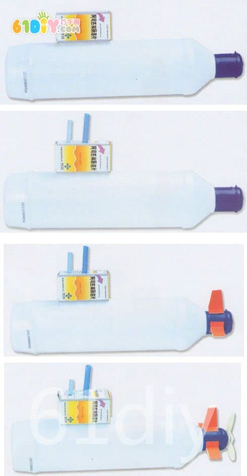 制作步骤: 1、将小纸盒固定在洗洁精瓶中间偏后一点的位置上。 2、在小纸盒上插上粗细、高矮不同的两段吸管。 3、将彩色卡纸对折,依图剪出三个小梯形,并固定在瓶盖上。 4、在瓶盖的前端用厚泡沫胶固定上三把快餐勺做螺旋桨,潜艇完成了。