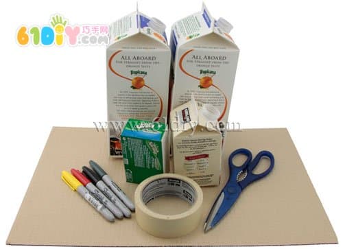 手工材料:牛奶盒或者果汁盒、彩色笔、纸胶带、剪刀、长方形小纸盒、硬纸板
