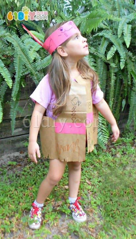 手工材料:大大的牛皮色纸袋、彩色纸、剪刀、胶水、彩笔、颜料、 羽毛