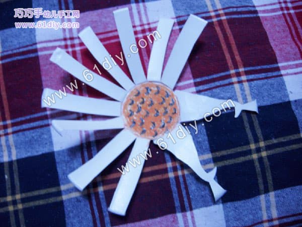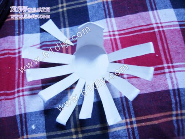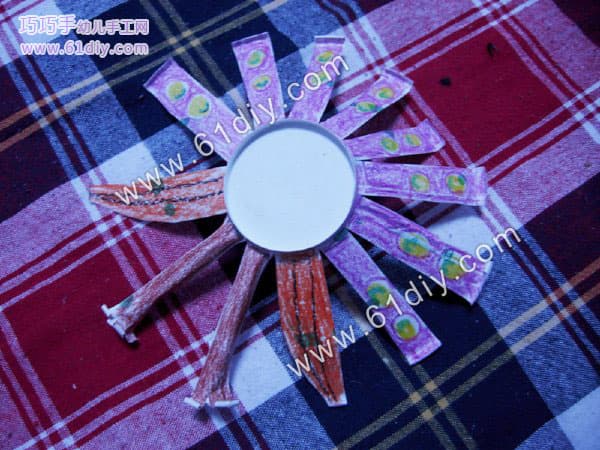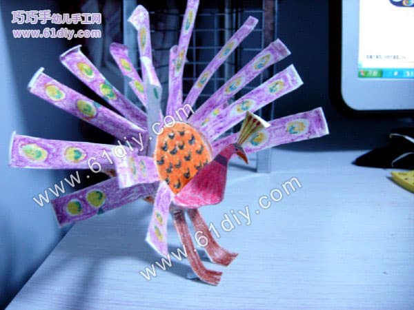 成品图 所需材料:两个次性纸杯,剪刀,双面胶,腊笔 先取一个纸杯,剪成一条条,剪到多一半就停下,尽量均匀 展开后是这样的 两个纸杯,都剪成这样。 其中一个中间剪一下做孔雀的头部 侧边大概剪下三角形 画好头部的图案,剪下来,即成上图所示 打开是这样的 另一半,也是中间剪开,然后再把两块分成四块,分别做孔雀的脚和尾巴,做脚的那部份在下面剪三个小口,向外折一下 脚底部细节图是这样的 另外两片做尾巴,剪成翅膀状 涂色,宝宝来完成 做头部那一只杯子的中间涂成这样 做孔雀翅膀的地方用笔画个圆形,做图案 与此同时,宝宝在给孔雀的脚涂上颜色 翅膀涂好的效果,因为是莹光灯下照的,有些变色,亲们凑合看吧 另一半,脚丫那用纸卷个卷用双面胶沾在里面,起固定和支撑作用 细节 上完色的效果 两部份均已做好,把纸杯底部对起来,透明胶粘上即可 晚上拍的成品图