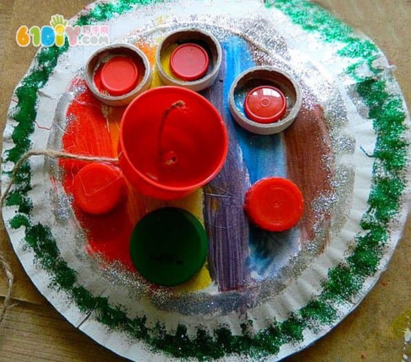 手工材料:纸盘、瓶盖、彩笔、颜料、胶水、绳子、剪刀、