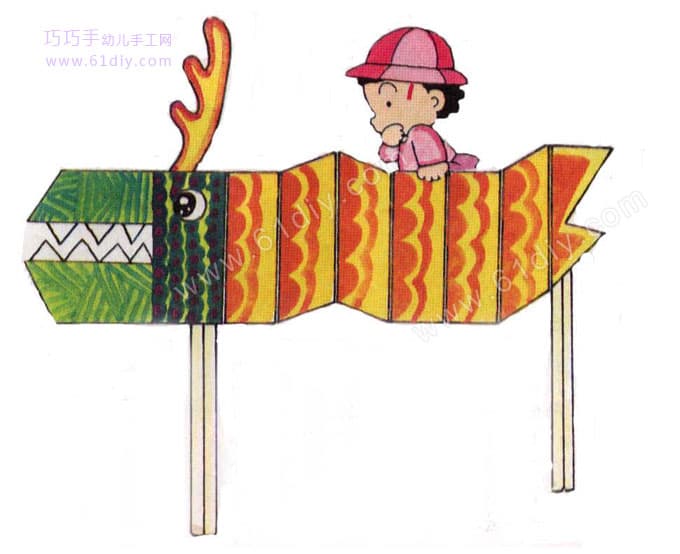 依喜好画出可爱的龙头形状,剪下黏贴于龙身前面。 龙手工 : 第三步 龙手工 : 第四步