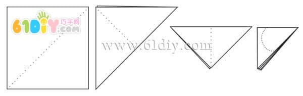 正方形纸对角折三次,沿圆弧剪开 手工材料:皱纹纸、彩色纸、亮光纸等都可以,剪刀