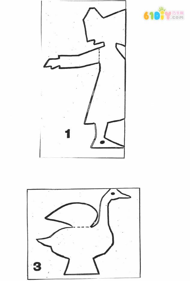 把纸对折了来剪鸭子和小女孩,剪好后再根据虚线折好。