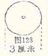长20cm宽0.7cm的布条,并在布条的一面刮上一层浆糊晾干备用,用手摇钻在铜板的圆心打一约0.4厘米的小孔(如图128)。