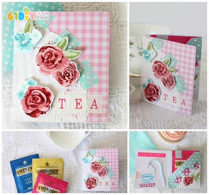 手工材料:卡纸、玫瑰花包装纸、彩色胶带、面线、蕾丝 蛋糕纸、印章、剪刀等