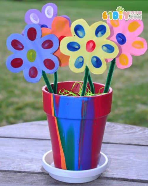 手工材料:卡纸、颜料、 毛根、胶水、花盆、剪刀