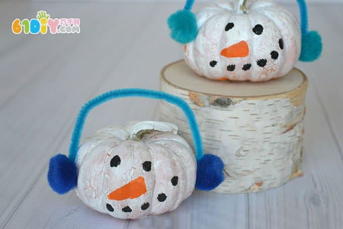 制作方法:把南瓜涂成白色,画上眼睛鼻子嘴巴。用毛根毛球制作耳套,用胶枪粘贴好。
