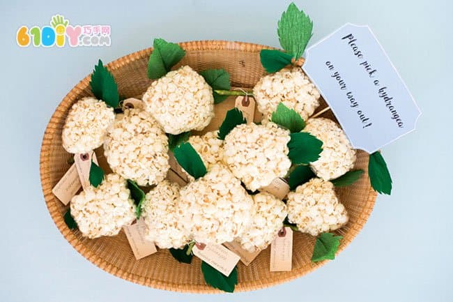 手工材料:爆米花、保鲜袋、 皱纹纸、剪刀、双面胶、线、卡纸、 吸管、绿色胶带等