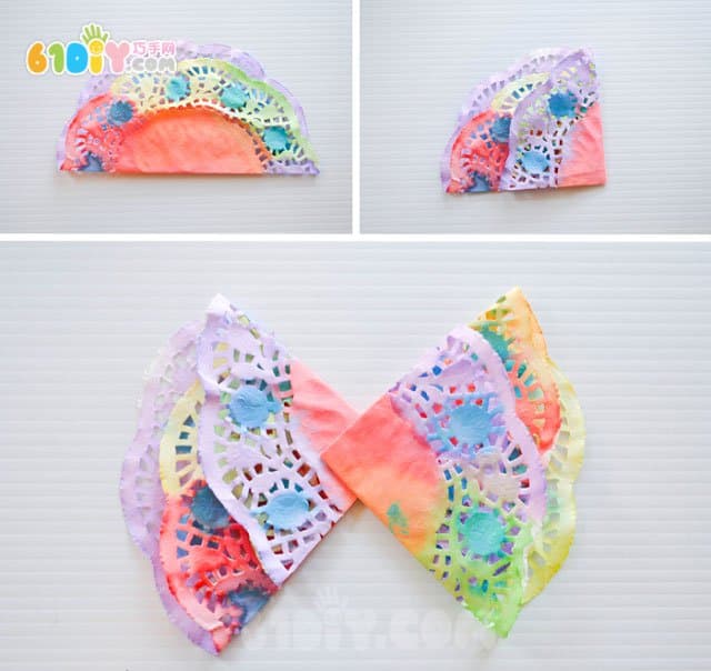 手工材料:蕾丝 蛋糕纸、颜料、木夹子、 毛根、胶水、剪刀、仿钻