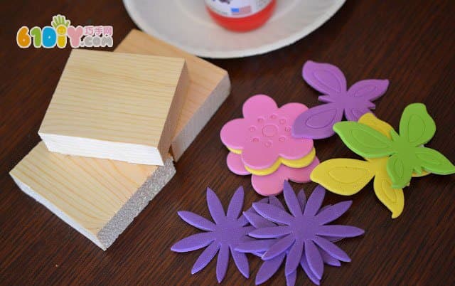 手工材料:小木块、海绵卡通贴纸