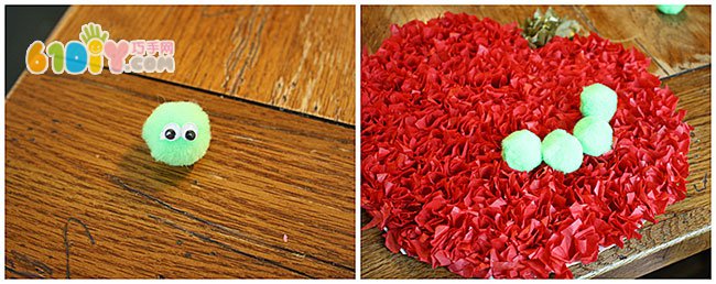 手工材料: 纸盘、搓纸、胶水、铅笔、毛球、动物眼睛、剪刀