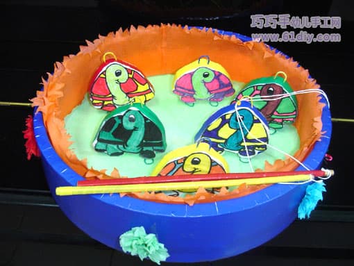 制作方法:将蛋糕盒沿边去掉一半后,将启用彩纸进行包装,将乌龟图案贴在泡沫上沿边刻出形状,用铁丝做成铁圈,放在乌龟背上,用绳子将竹筷和铁钩连在一起。