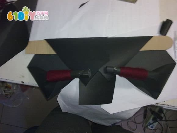 11.将一块黑纸板粘贴在扁方下、旗头中央位置,起遮挡作用!(这样看旗头正面时,就不会看到你的头发和旗头的内部了)