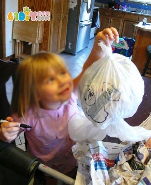 手工材料:塑料袋、 报纸、黑色记号笔、绳子