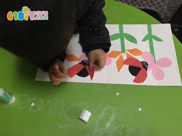 多妈粘贴了第一只小瓢虫,然后让多多自己粘贴第二只瓢虫