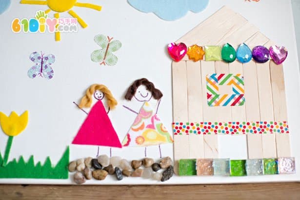 雪糕棒贴的小 房子,贴上亮晶晶的水钻,两个小女孩快乐的在院子里玩耍