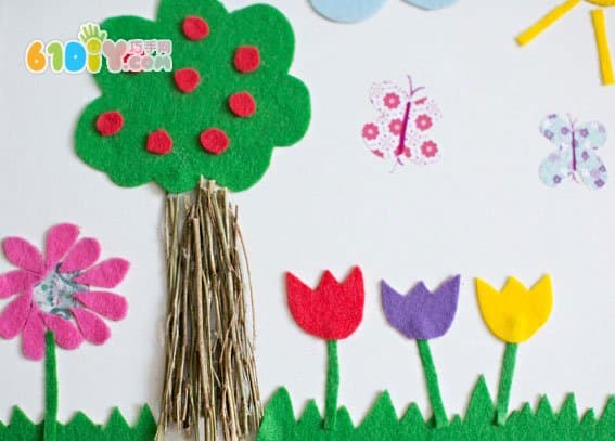 不织布和 树枝贴的果树、不织布小花和彩色纸 蝴蝶