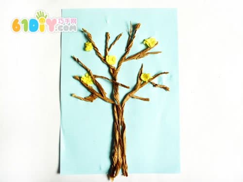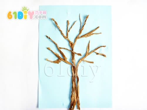 1、蓝色纸当背景色;把棕色纸撕成条,然后搓成长条当树干树枝。
