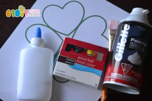 手工材料:四叶草模板、乳胶、剃须泡沫、食用色素、笔、亮粉