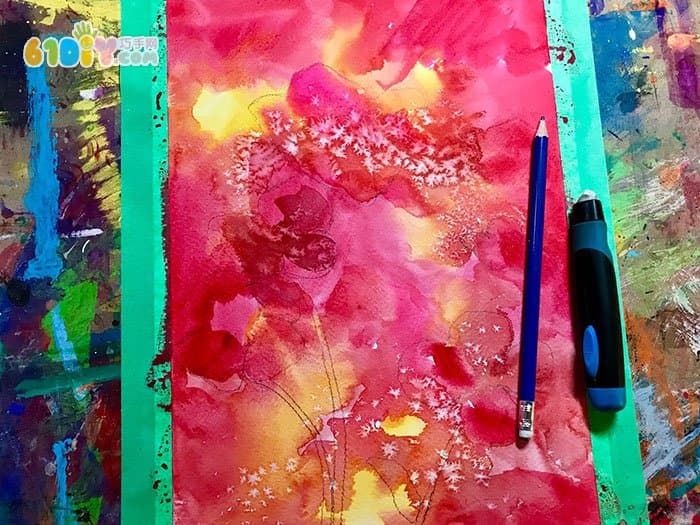 在颜料没有干的时候撒上海盐,晾干后刷去盐花,就会形成小