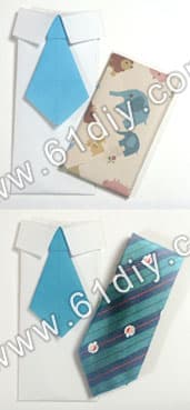 折法: 用A4大小的纸来折; 1、长边、短边分别对折出两条中线; 2、上边向下,折到水平中线,然后展开,留下折痕; 3、上边向下折,折到上一步得到的折痕上; 4、翻面; 5、左、右两侧的边折到垂直中线上,然后展开,留下折痕; 6、右侧边上贴上胶带(位置参照上图所示),将左、右两侧的边折到中线上,并用胶带粘好,固定; 7、上面的两个角向下拉,红线所标位置压平(可参照下图); 8、翻面; 9、下面的边向上折一点; 10、用胶带粘; 11、将折好的领带(领带的折法)贴在上图所示位置即可。