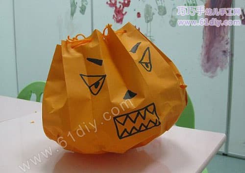 第三步:在两头打上孔 第四步:将准备好的毛线,剪下两条,一长一短,分别穿过两头的孔,扎起来,短绳一头绑的紧一些,长绳绑松 第五步:将扇子两头粘起来 第六步:定型。手从长绳绑的一端伸进,用力将纸撑开成南瓜模样 第七部:画脸。用黑色马克笔在南瓜上画上眼睛、美貌、嘴和牙齿